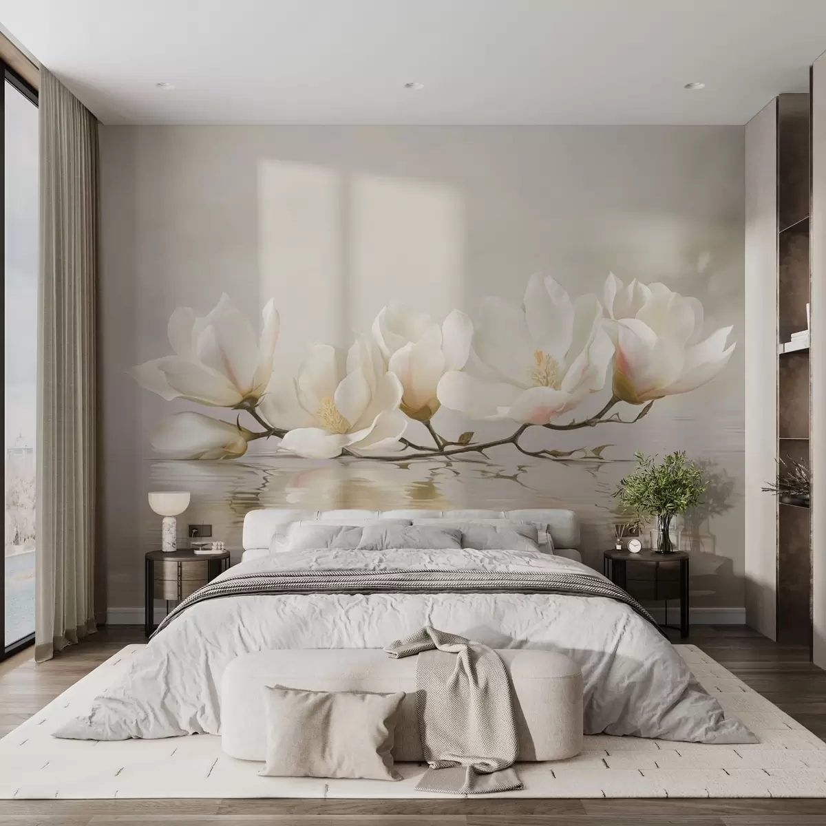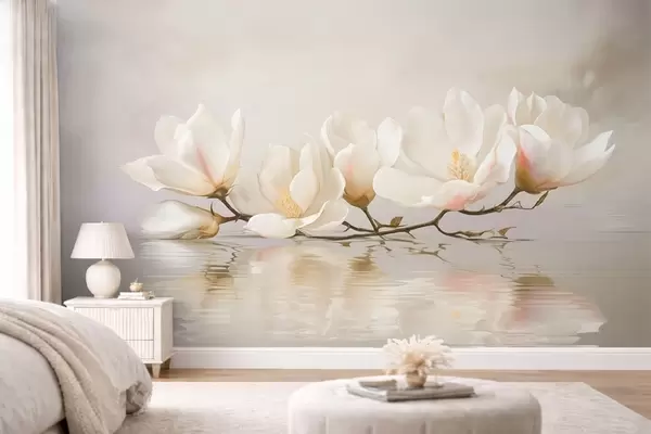 Fotomurales Ligeras flores de magnolia en una rama sobre el reflejo del agua. Nr. w05353