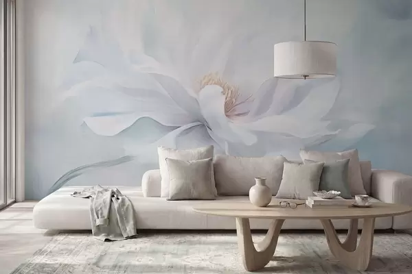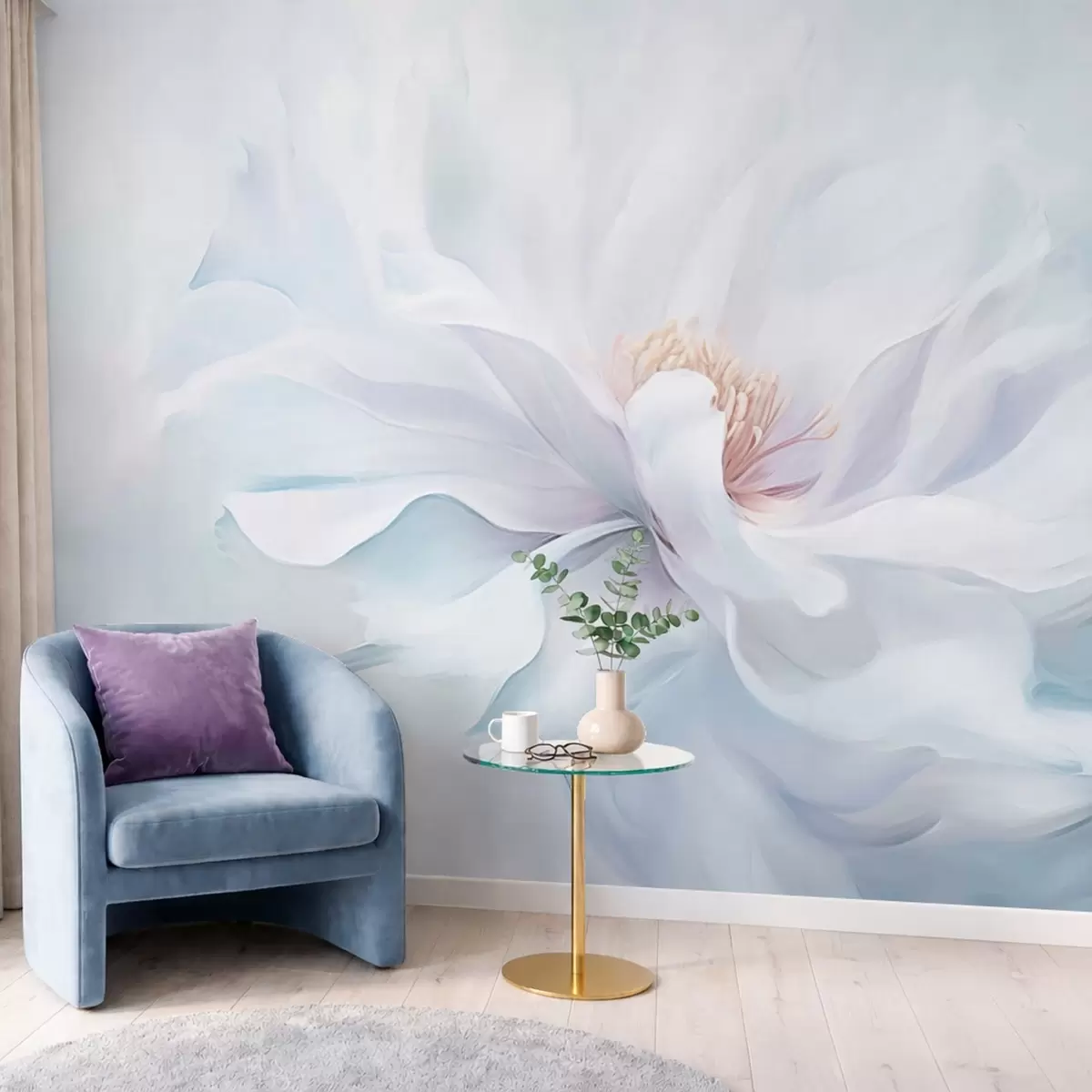 Fotomurales Flor blanca suave con pétalos fluidos sobre fondo azul. Nr. w05354