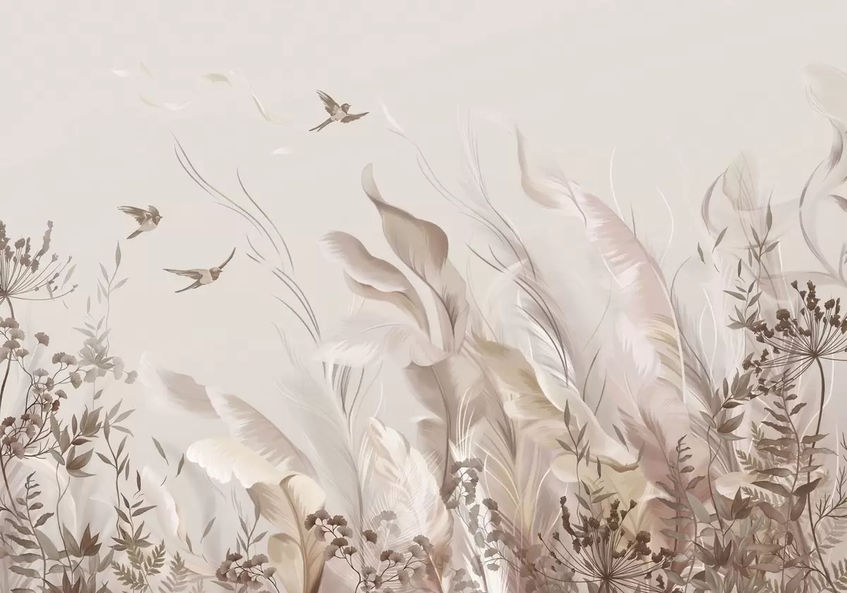 Fotomurales Plumas suaves, hierbas y pájaros en tonos claros Nr. w05395