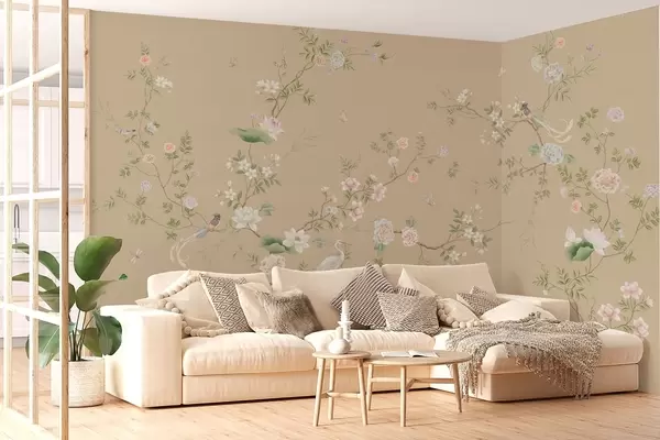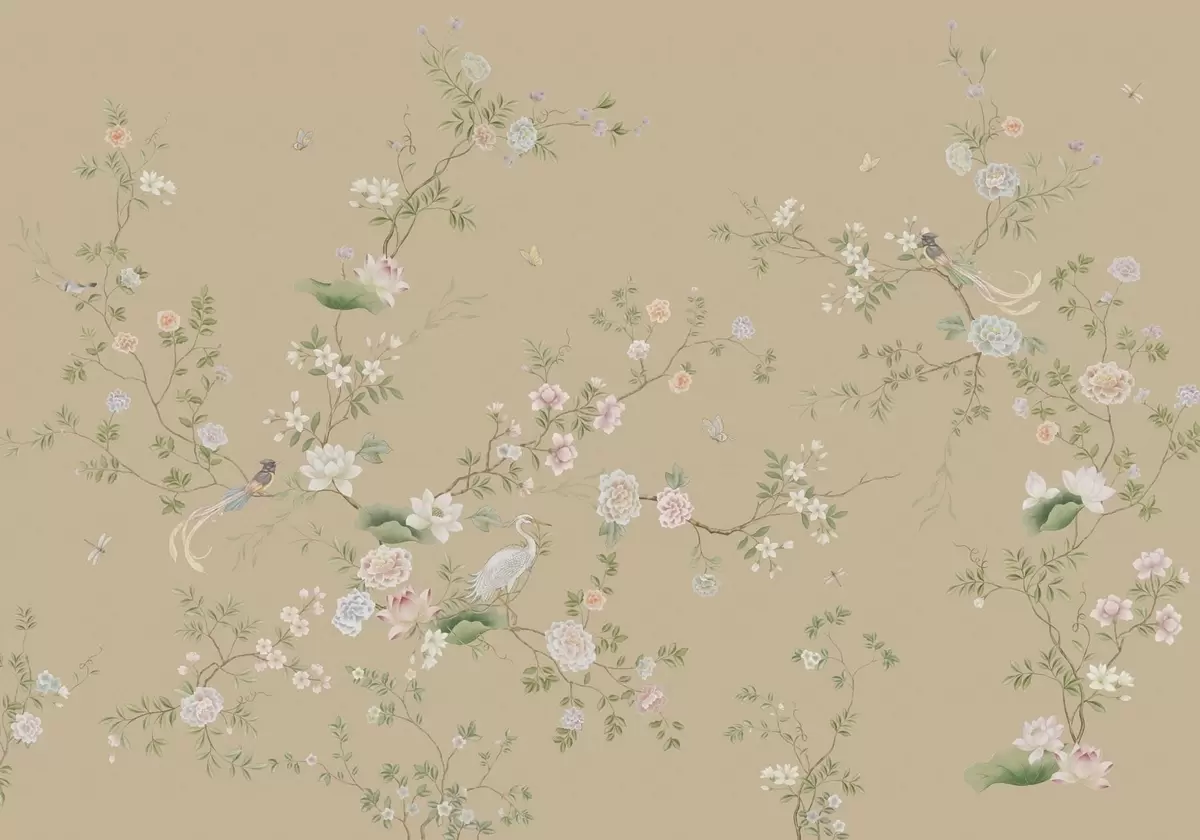 Fotomurales Ramas en flor con pájaros sobre un fondo beige cálido Nr. w05416v2