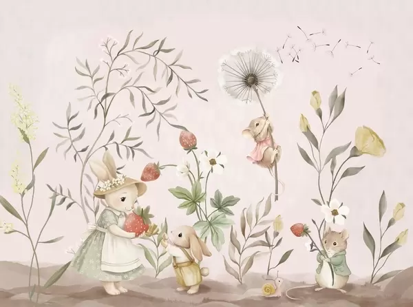Fotomurales Ilustración infantil de un conejito y un ratoncito entre plantas y flores Nr. w05422