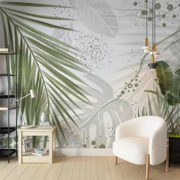 Fotomurales Hojas y frondas de palmeras verdes tropicales, con formas abstractas y salpicaduras en tonos verdes y blancos. Nr. w07918