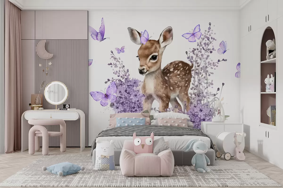 Fotomurales Un ciervo joven con ojos grandes y pelaje moteado rodeado de flores y mariposas de color púrpura. Nr. w07931