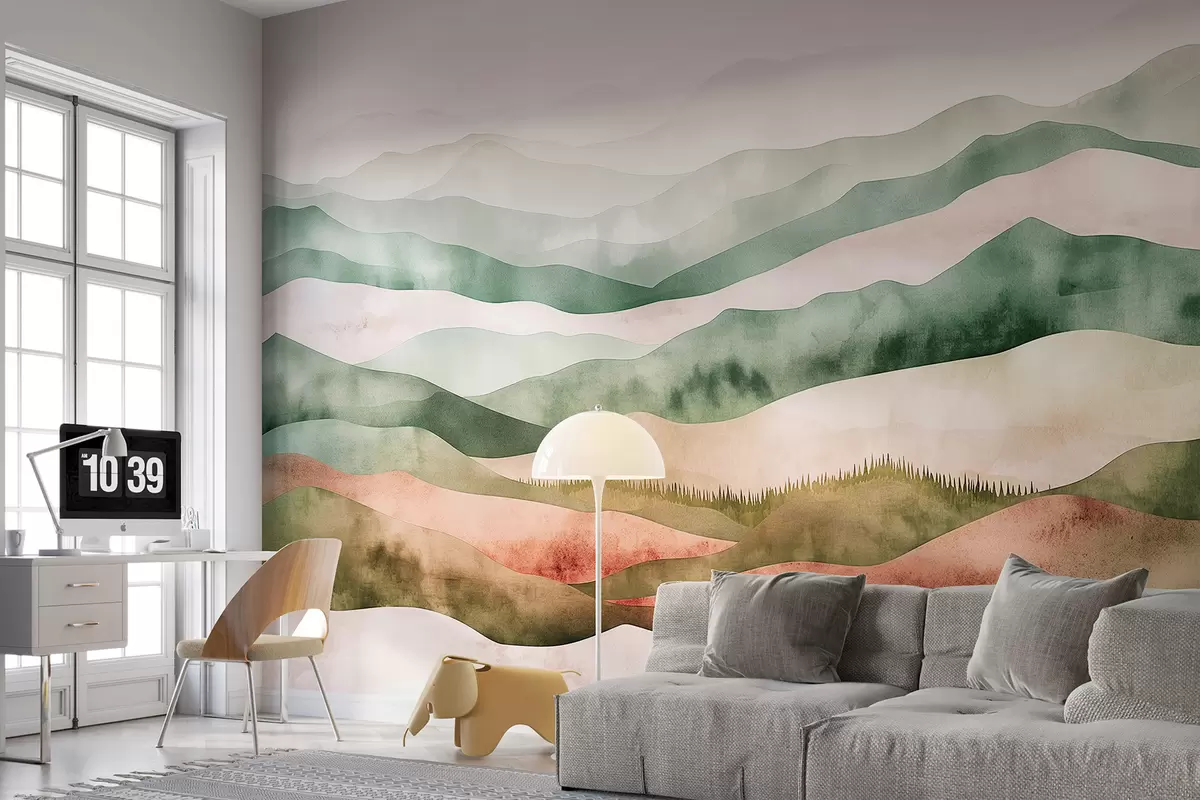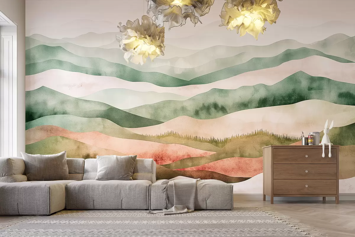 Fotomurales Paisajes de montañas acuarelas, bosques, naturaleza, colores verdes y beige. Nr. w07950v1