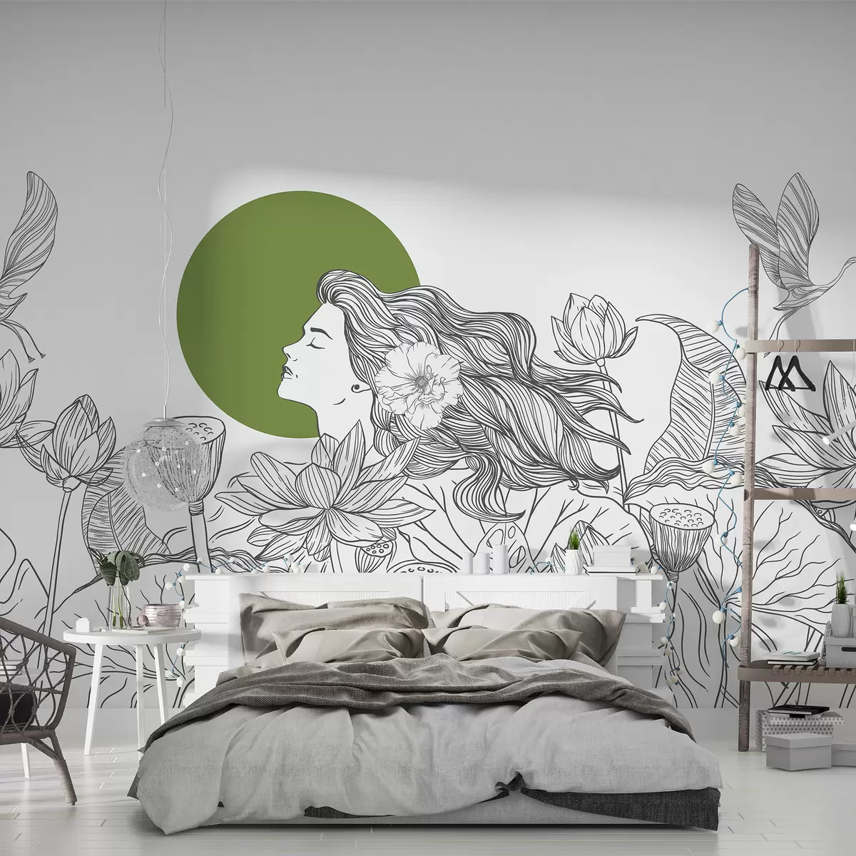 Fotomurales Mujer en la naturaleza, dibujo lineal, flores de loto, hojas grandes, pájaros voladores, color gris y verde Nr. w07988v3
