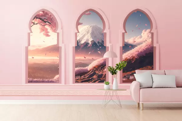 Fotomurales Grandes ventanales de estilo oriental con impresionantes vistas del Monte Fuji en suave color melocotón Nr. w08082
