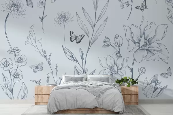 Fotomurales Flores y mariposas monocromáticas boho en azul Nr. w08088v2