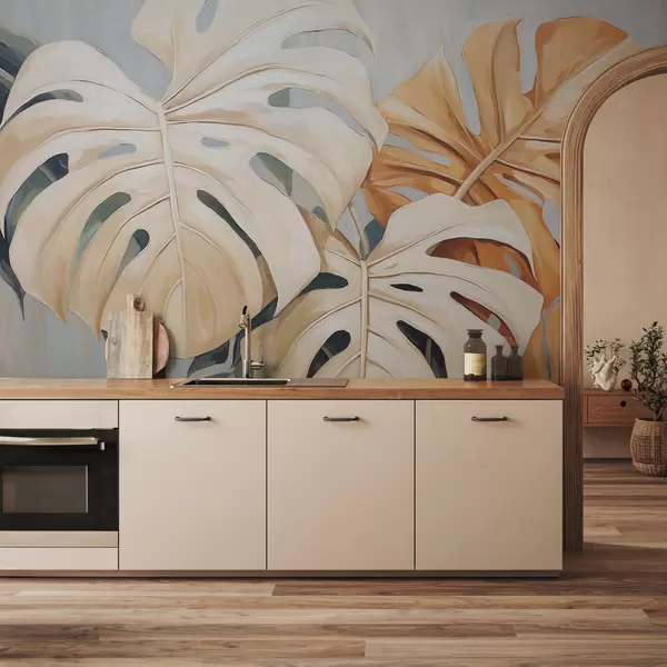 Fotomurales Hojas de monstera, color azul, blanco, naranja Nr. w08124