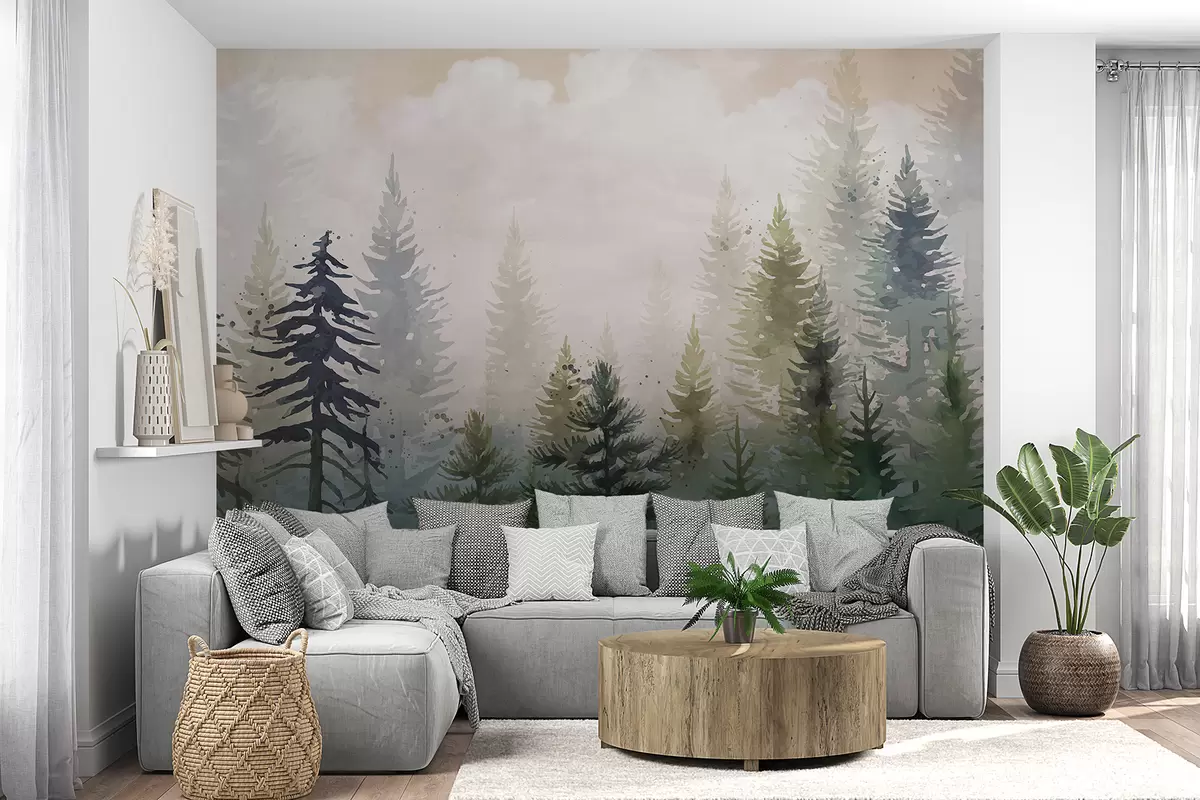 Fotomurales Bosque de altos pinos de hoja perenne en un entorno brumoso y lleno de un paisaje de nubes suaves y brumosas. Nr. w08160