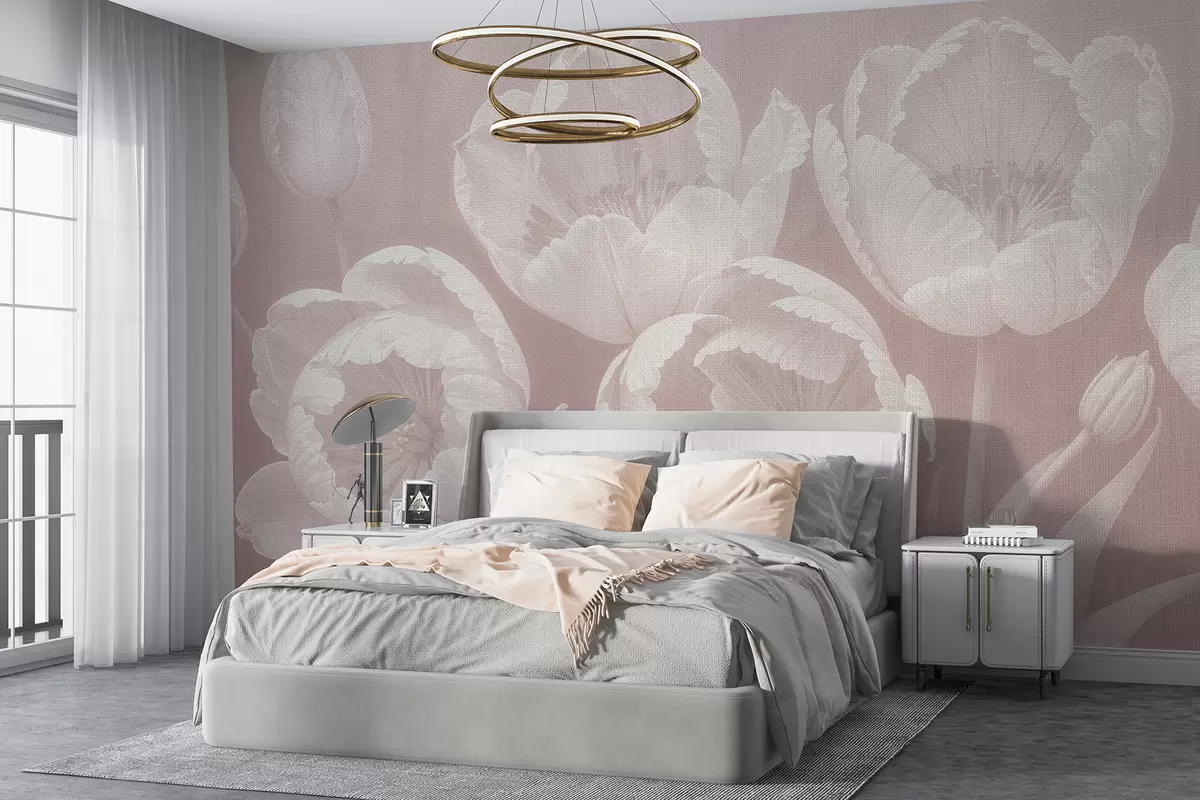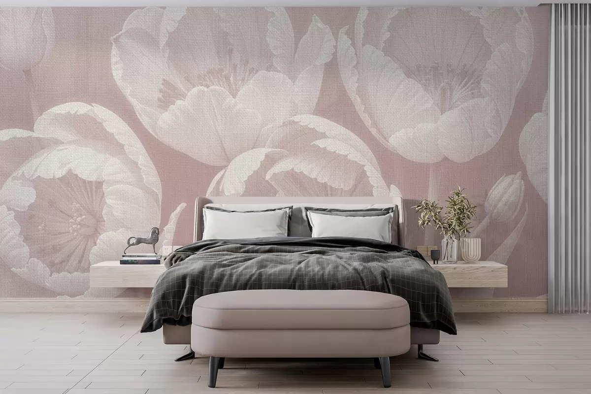 Fotomurales Dibujo de tulipanes blancos con fondo beige difuminado con textura de lienzo suave, impresión monocromática minimalista Nr. w08193