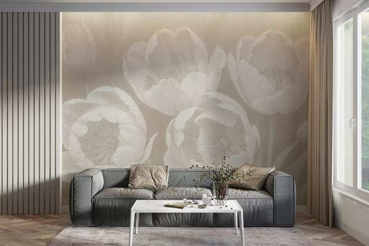 Fotomurales Dibujo de tulipanes blancos con fondo borroso rosa con textura de lienzo suave, impresión monocromática minimalista Nr. w08193v1