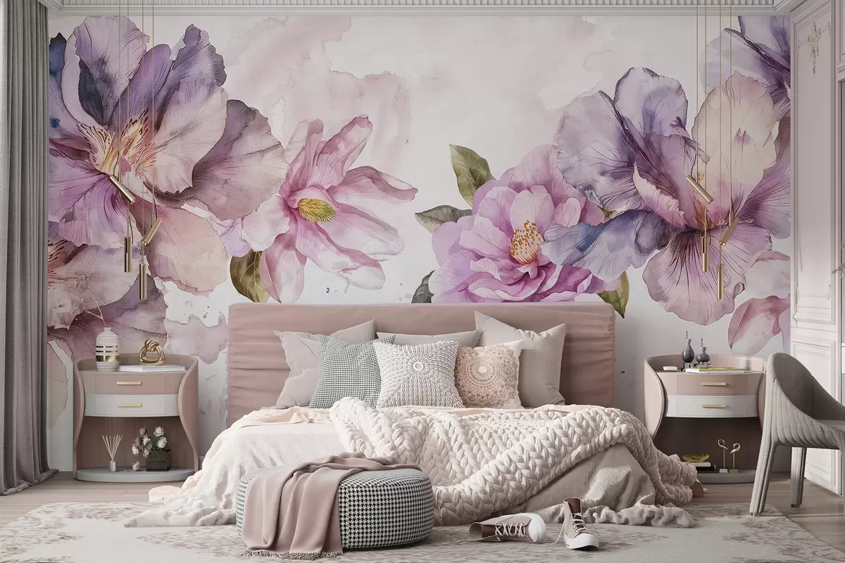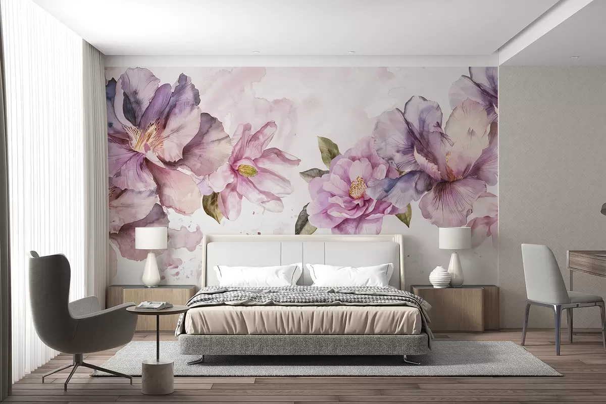murales de pared Delicadas flores de acuarela de color rosa y morado con pétalos suaves y hojas verdes sobre un fondo claro. w08238