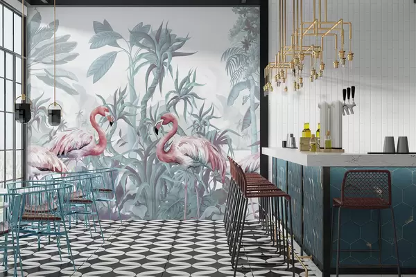 Fotomurales Flamencos rosas de pie en un exuberante follaje tropical con grandes hojas de palmera y flores en tonos verdes y blancos Nr. w08250v1