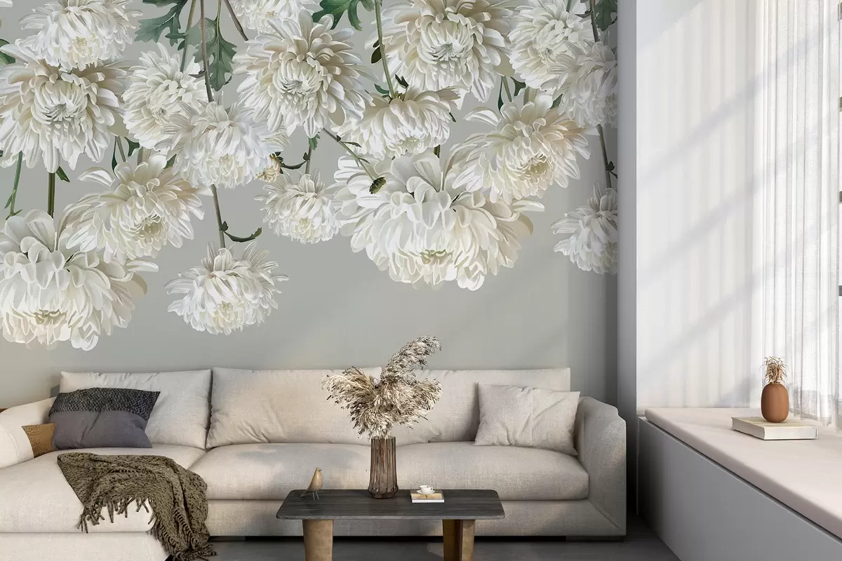 Fotomurales Flores blancas de crisantemo con hojas verdes sobre fondo gris claro Nr. w08251