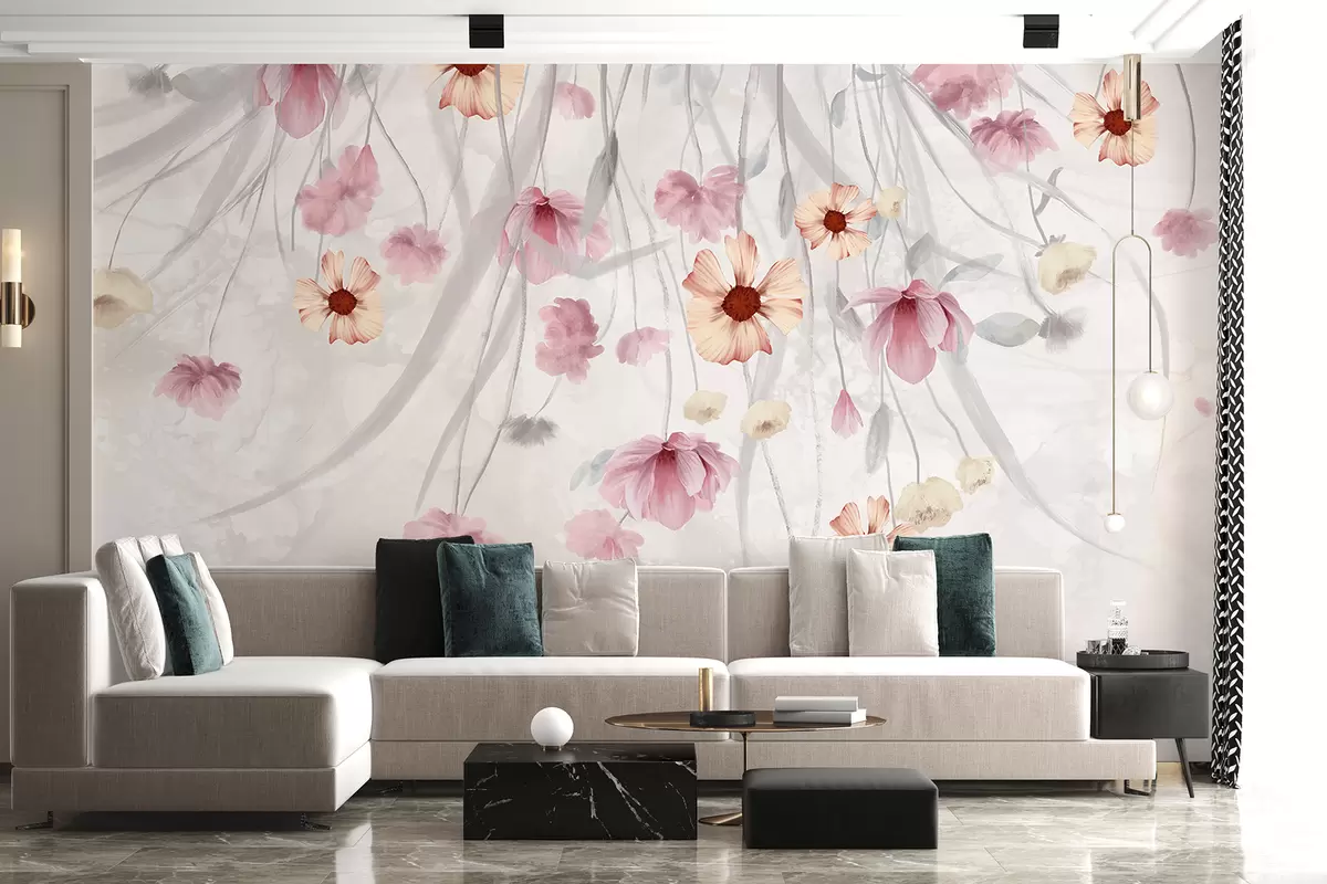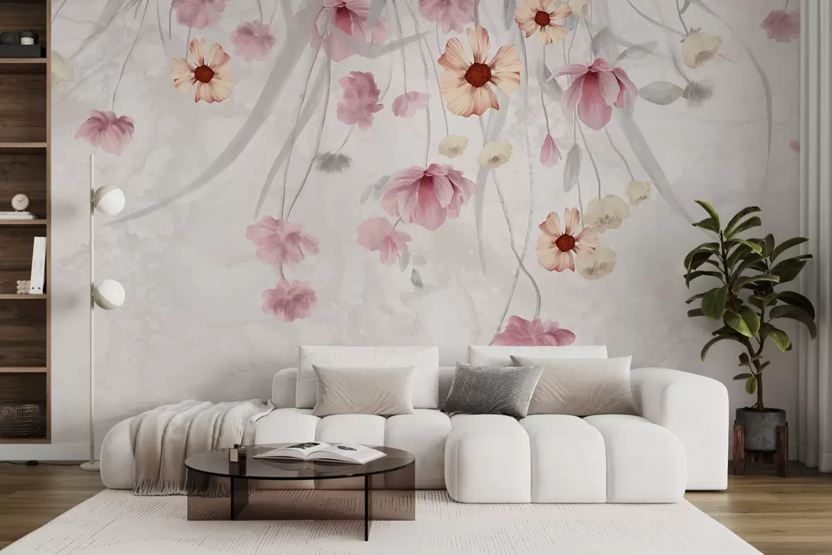Fotomurales Delicadas flores de color rosa pastel y amarillo con centros amarillos que caen en cascada sobre un fondo suave y difuminado Nr. w08261v1