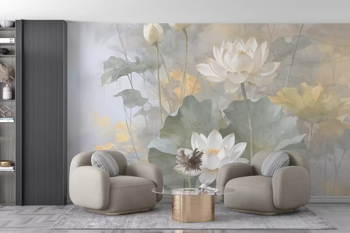 Fotomurales Flores de loto blancas con hojas en un estanque con un suave fondo difuminado amarillo y verde Nr. w08275