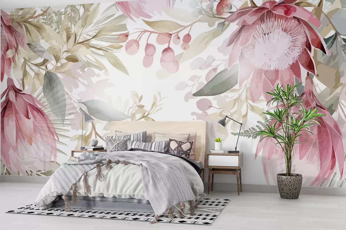 Fotomurales Grandes proteas rosas y blancas transparentes con exuberantes hojas verdes sobre un fondo claro Nr. w08315