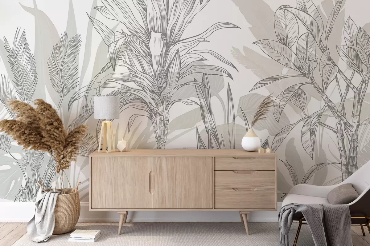 Fotomurales Un gráfico de plantas tropicales con grandes y exuberantes hojas y flores en tonos grises y blancos con siluetas florales verdes Nr. w08327