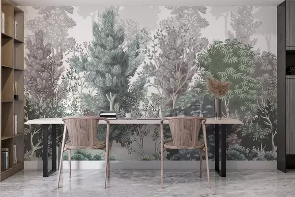 Fotomurales Un bosque exuberante y verde con varios tipos de árboles y arbustos de hoja perenne, ricos verdes del otro follaje gris Nr. w08341v1