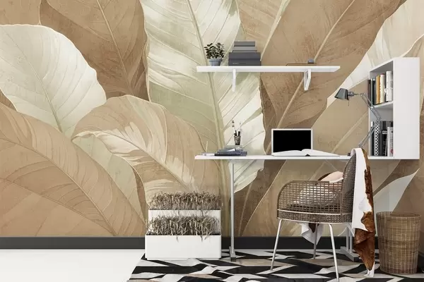 Fotomurales Primer plano de grandes hojas tropicales decorativas, exuberantes y texturizadas, en tonos marrones y beige Nr. w08373v1