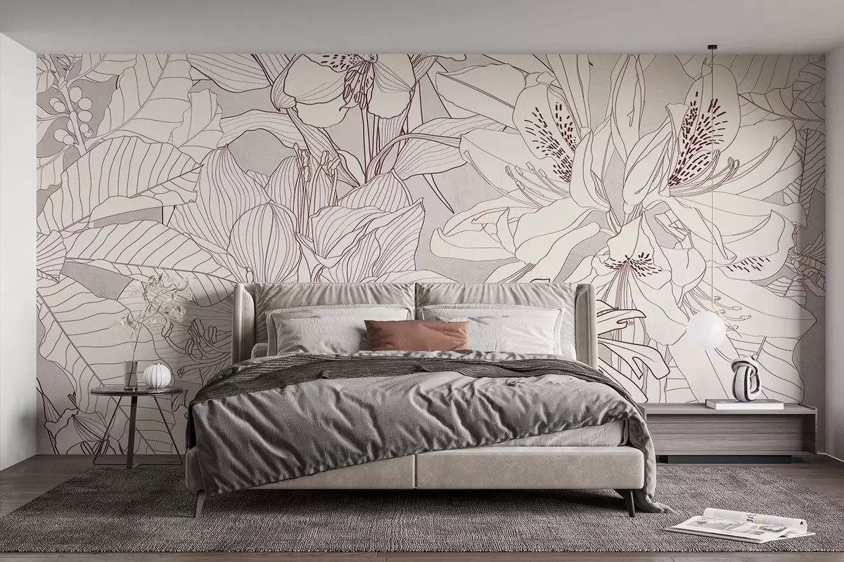 Fotomurales Estampado floral detallado en bordo y gris con varios tipos de flores y hojas, un diseño botánico exuberante e intrincado Nr. w08385