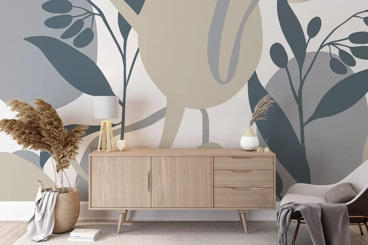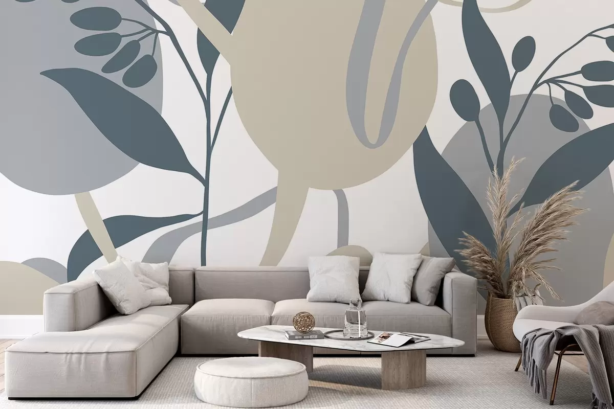 Fotomurales Un estampado floral abstracto minimalista con formas beige y grises sobre fondo blanco Nr. w08400