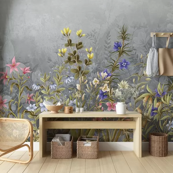 Fotomurales Un exuberante y vibrante estampado de texturas florales con coloridas flores y plantas con intrincados detalles y texturas Nr. w08428v1