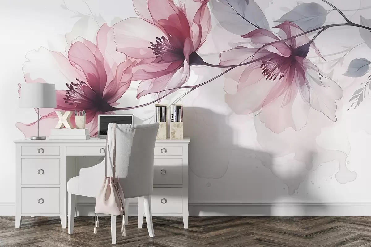 Fotomurales Delicadas flores transparentes rosas y grises con pétalos suaves y difuminados sobre fondo blanco Nr. w08429