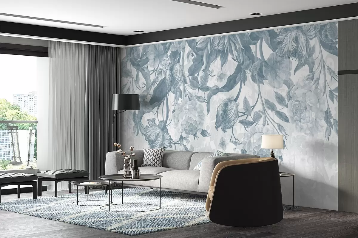 Fotomurales Un exuberante arreglo floral con grandes flores azules y blancas, con hojas y tallos en azul pastel Nr. w08435v1
