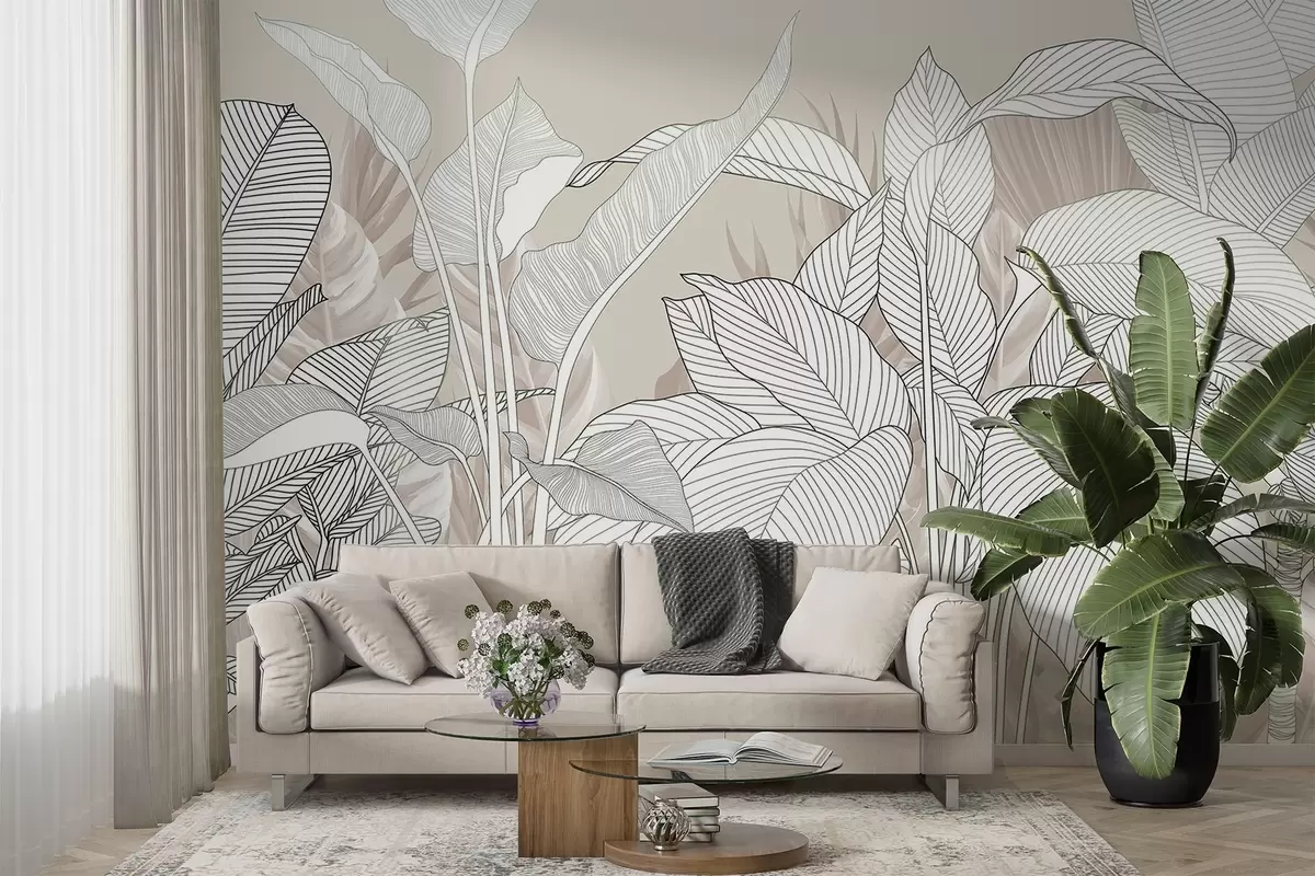 Fotomurales Ilustración monocroma de grandes hojas y follaje estilizados con intrincadas líneas y texturas Nr. w08436v1