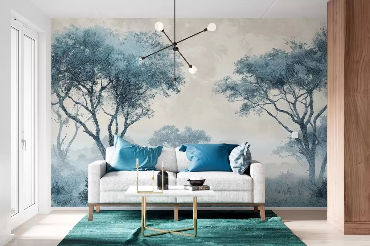 Fotomurales Un paisaje brumoso y sereno con árboles silueteados en primer plano y una suave niebla en tonos azules y beige Nr. w08442