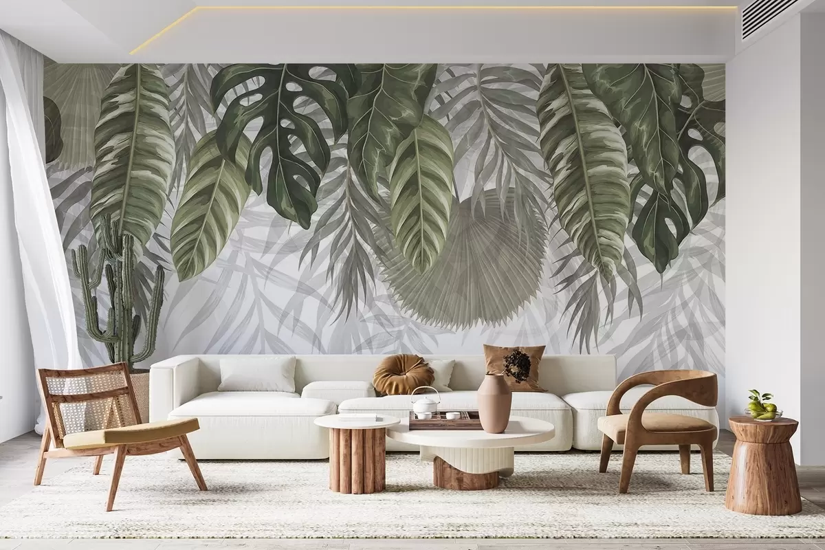 Fotomurales Hojas tropicales en tonos verdes, incluidas grandes hojas de monstera y hojas de palmera, sobre fondo blanco Nr. w08443