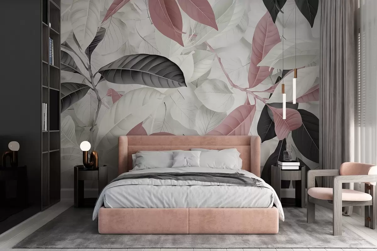 Fotomurales Gran estampado de hojas rosas y grises sobre un fondo con textura de hojas claras, que crea una exuberante sensación tropical Nr. w08468
