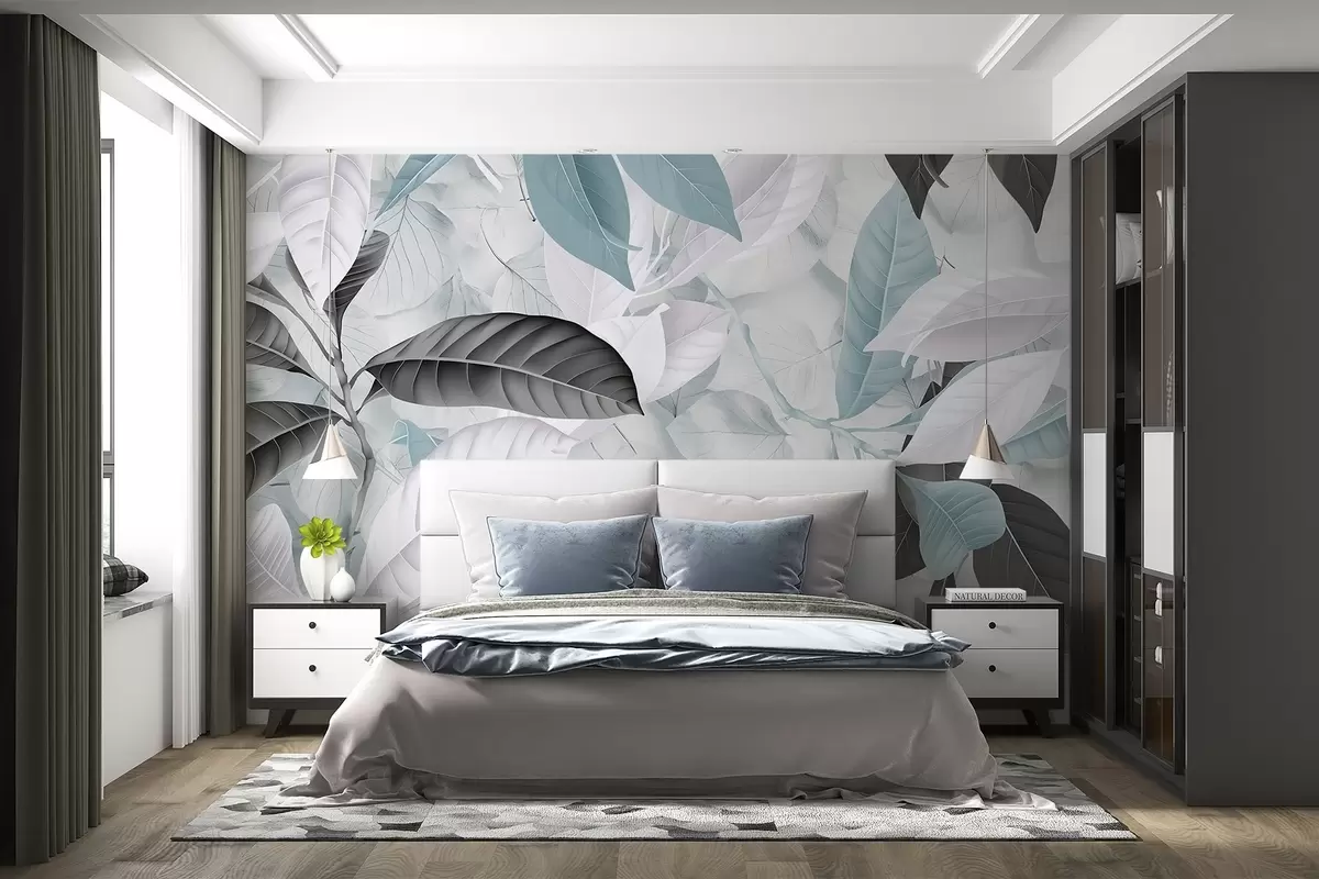 Fotomurales Gran estampado de hojas azules y grises sobre un fondo con textura de hojas claras, que crea una exuberante sensación tropical Nr. w08468v1