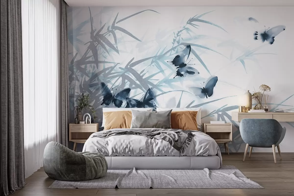 Fotomurales Texturas de hojas y tallos de bambú con mariposas azules voladoras de alas transparentes Nr. w08524