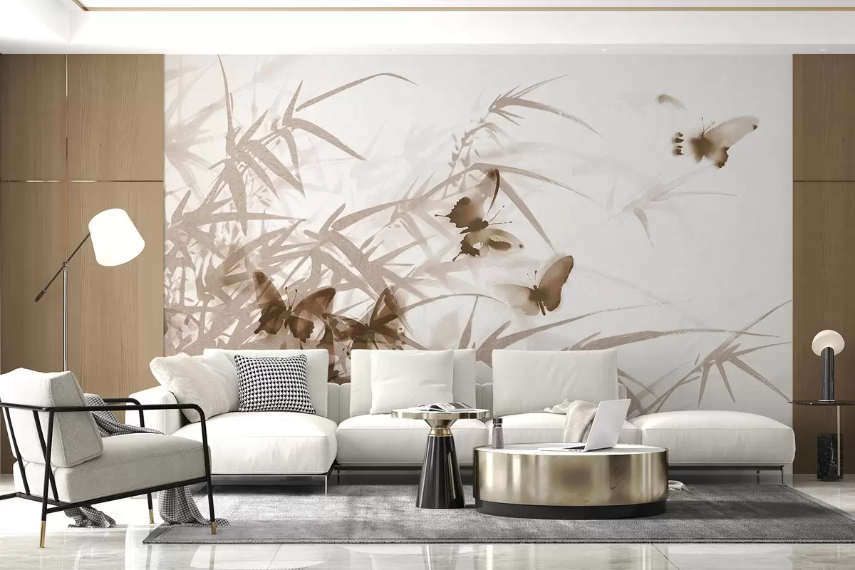 Fotomurales Texturas de hojas y tallos de bambú con mariposas marrones voladoras de alas transparentes Nr. w08524v1