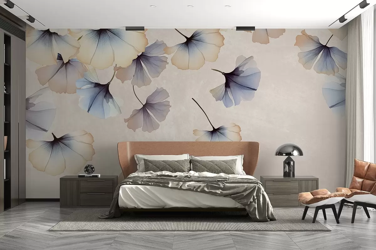 Fotomurales Hojas de ginkgo de colores pastel azul y beige con delicados pétalos flotando en el aire sobre un fondo de texturas Nr. w08578