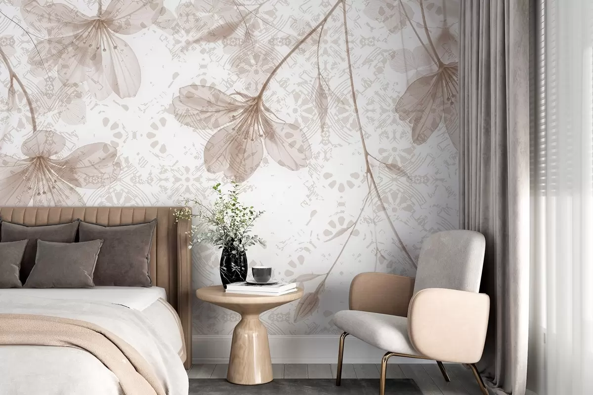 Fotomurales Delicadas flores beige y blancas con largos tallos y pétalos sobre un fondo de textura suave y difuminada Nr. w08588v1