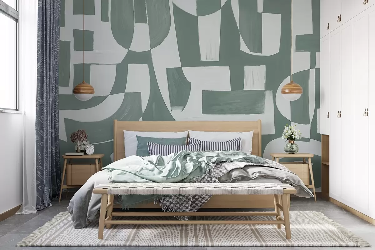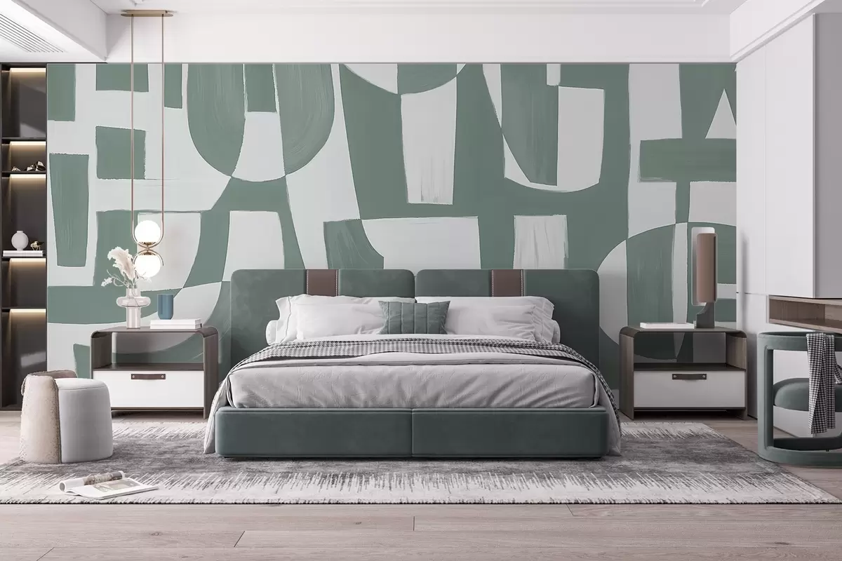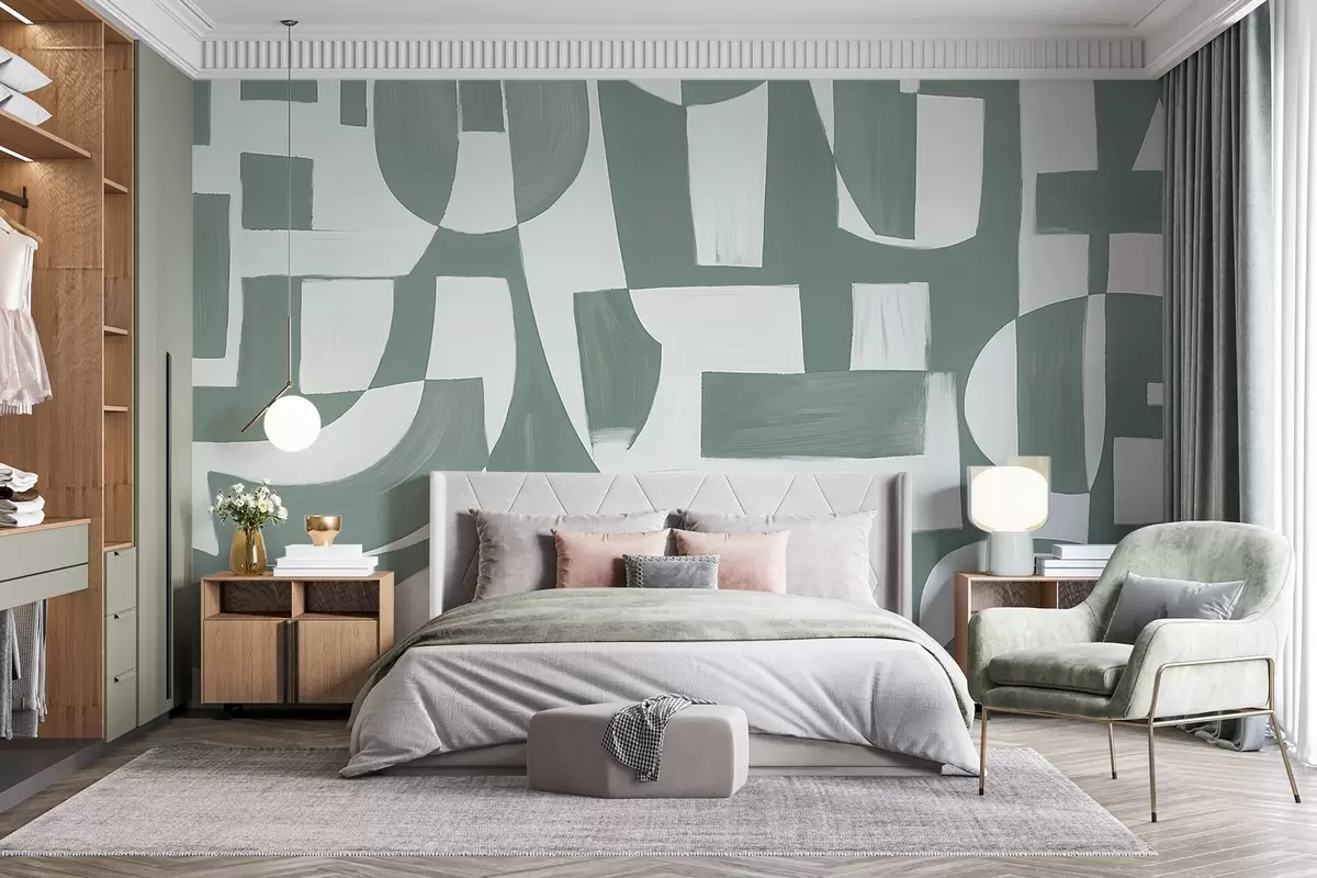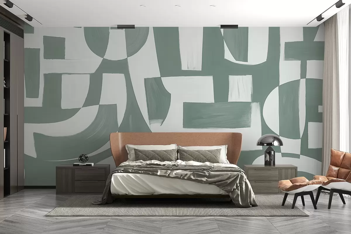 Fotomurales Formas y motivos geométricos abstractos en verde y blanco que crean una composición visualmente impactante y dinámica Nr. w08608v1