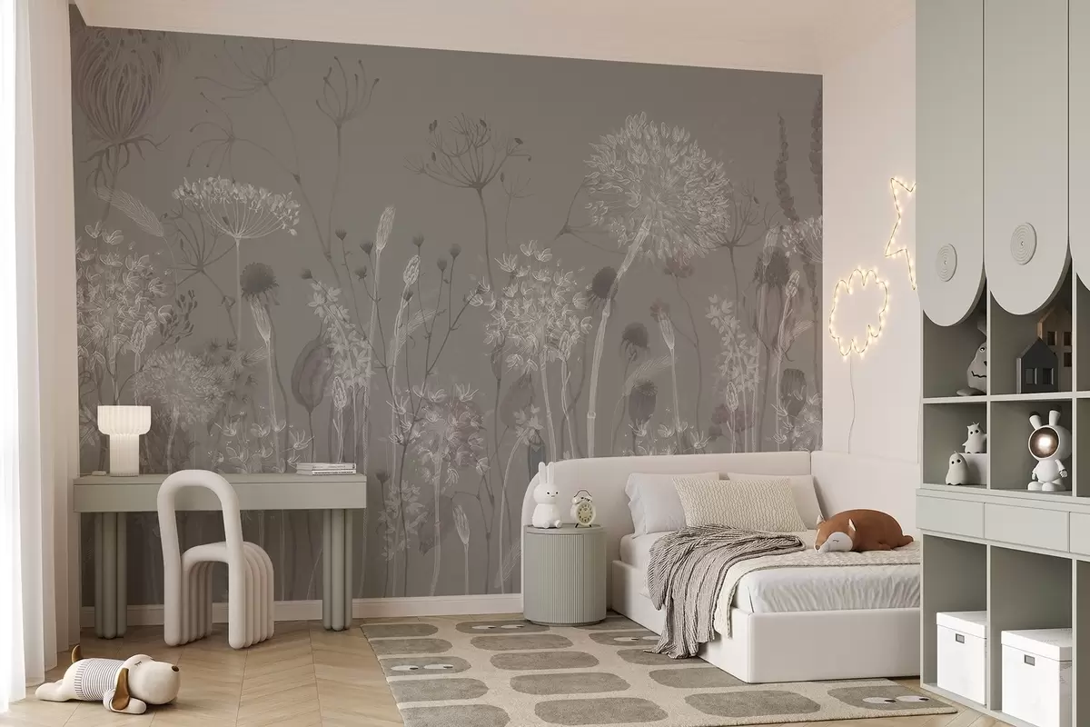 Fotomurales Dientes de león y flores silvestres en estilo acuarela en tonos azul grisáceo Nr. w08637v3