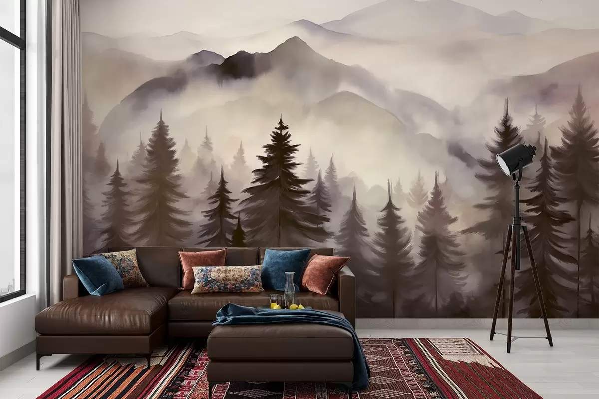 Fotomurales Paisaje de montaña con un bosque de pinos y montañas en capas durante el amanecer con niebla ligera acuarela imitación arte Nr. w08639v1