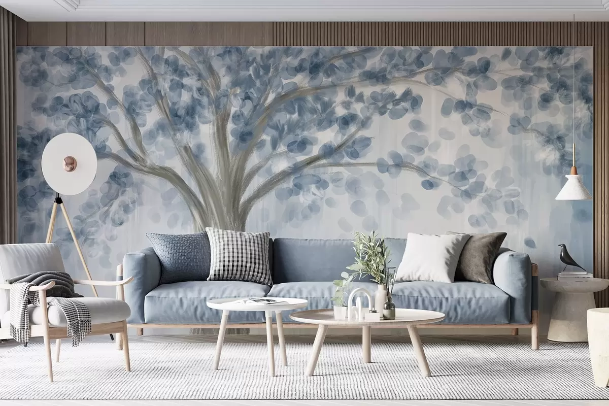 Fotomurales Un gran árbol con hojas suaves y abstractas en azul sobre un fondo claro y neutro que realza los tonos del árbol Nr. w08669v1