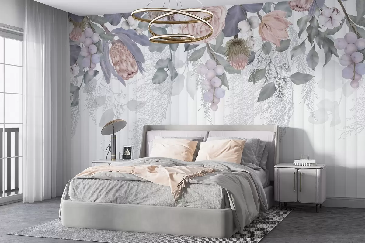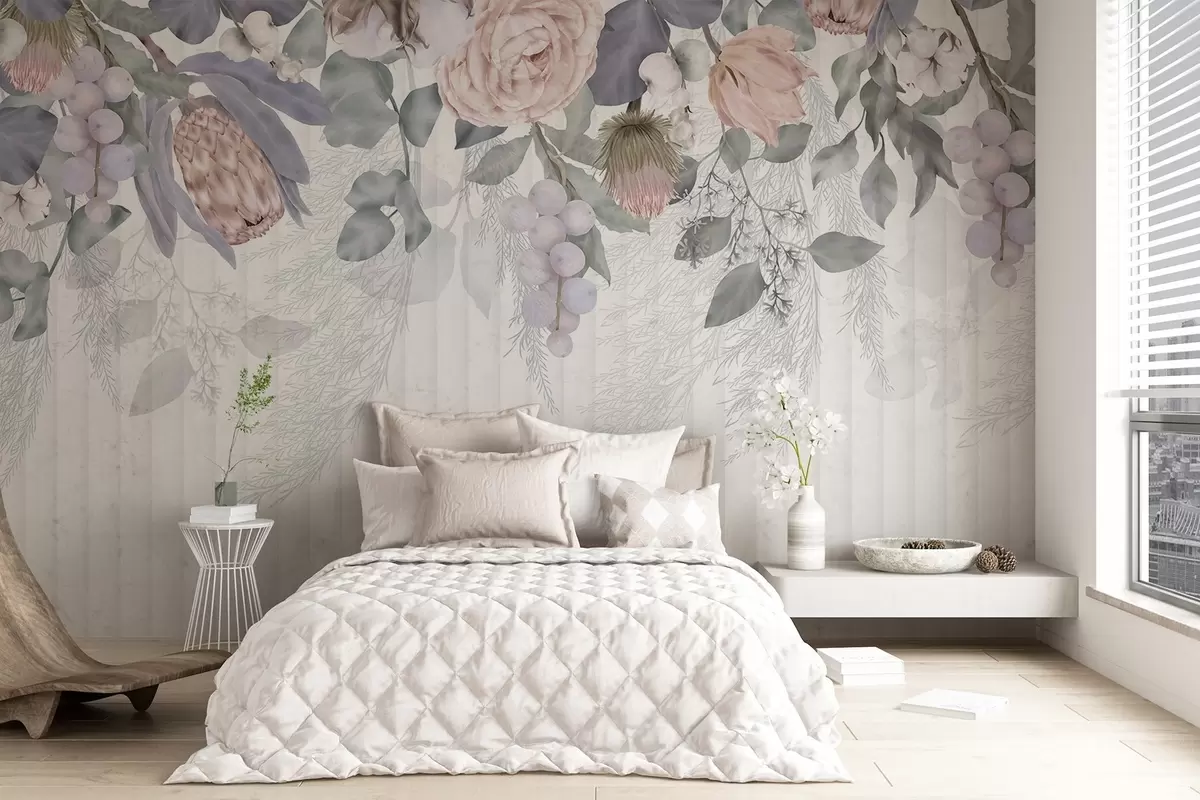 Fotomurales Un floral de rosas rosadas en tonos pastel, flores de protea, ramas de eucalipto y bayas sobre fondo texturizado Nr. w08700