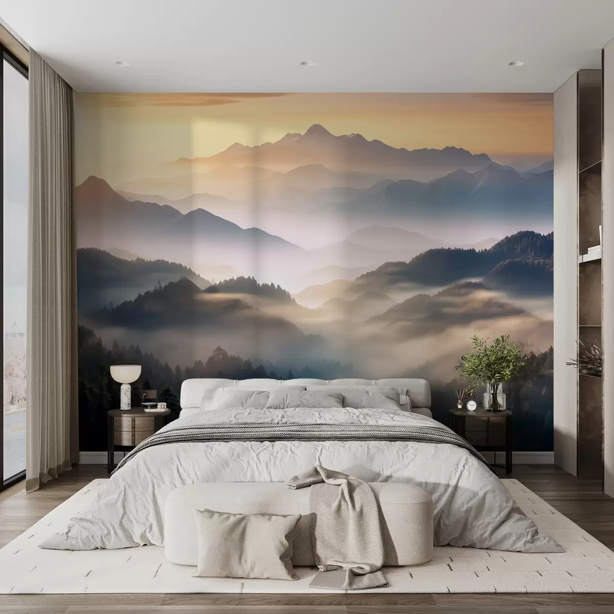 Fotomurales Sereno paisaje de montaña al amanecer, con suave bruma envolviendo los pinos Nr. w08748