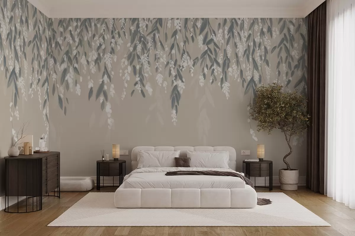 Fotomurales Ramas de follaje en cascada en tonos de verde apagado con flores y hojas blancas sobre fondo beige Nr. w08781