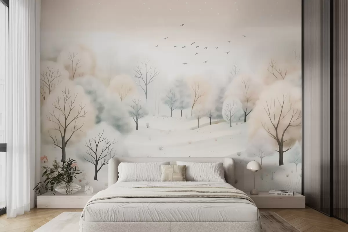 Fotomurales Bosque invernal con árboles, casitas, pájaros y nieve en estilo acuarela ligera Nr. w08815