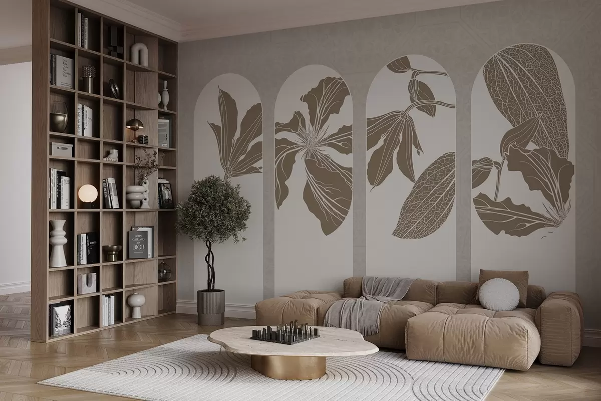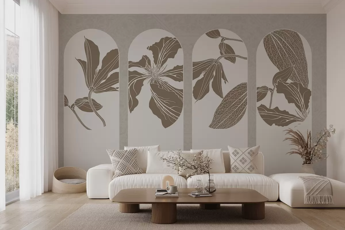 Fotomurales Elegantes arcos con diseños florales en beige y blanco, sobre fondo beige texturado, estilo minimalista Nr. w08866