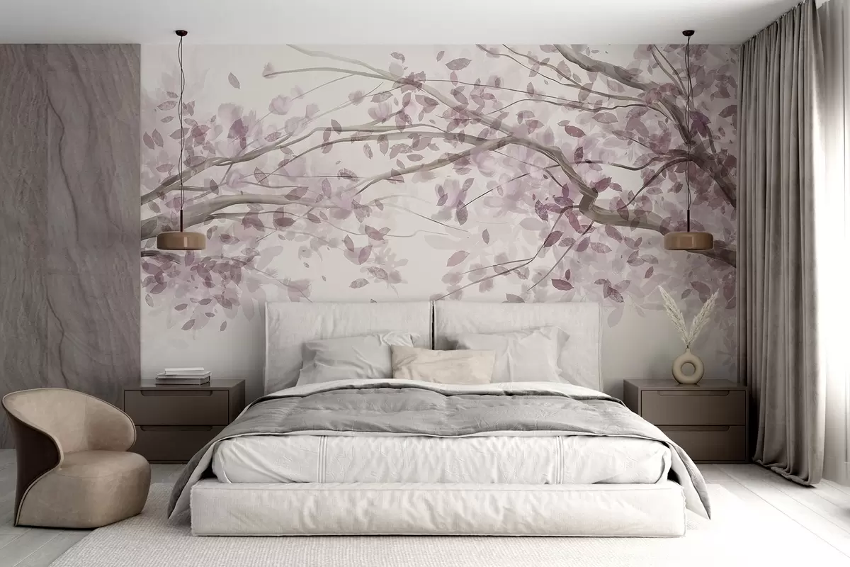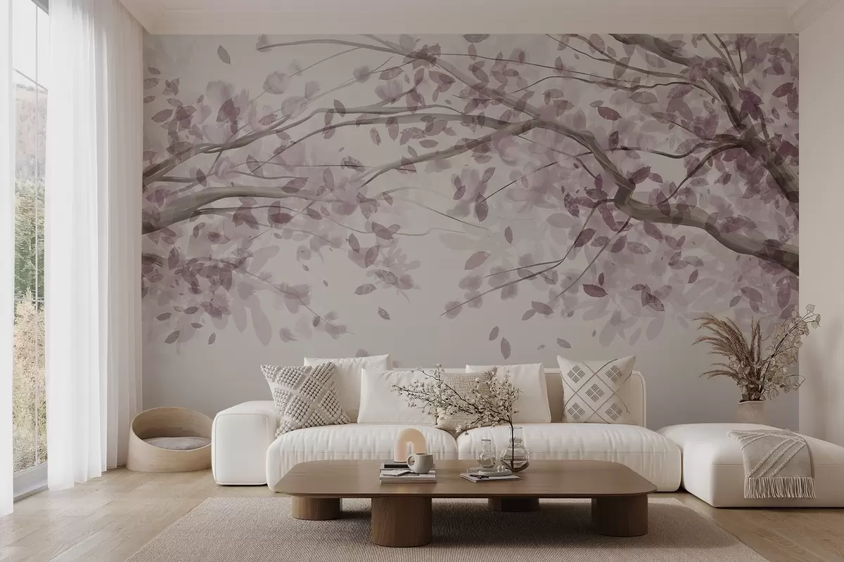 Fotomurales Ramas en flor con hojas rosas, colores suaves, detalles delicados, estilo acuarela, sobre fondo claro Nr. w08867