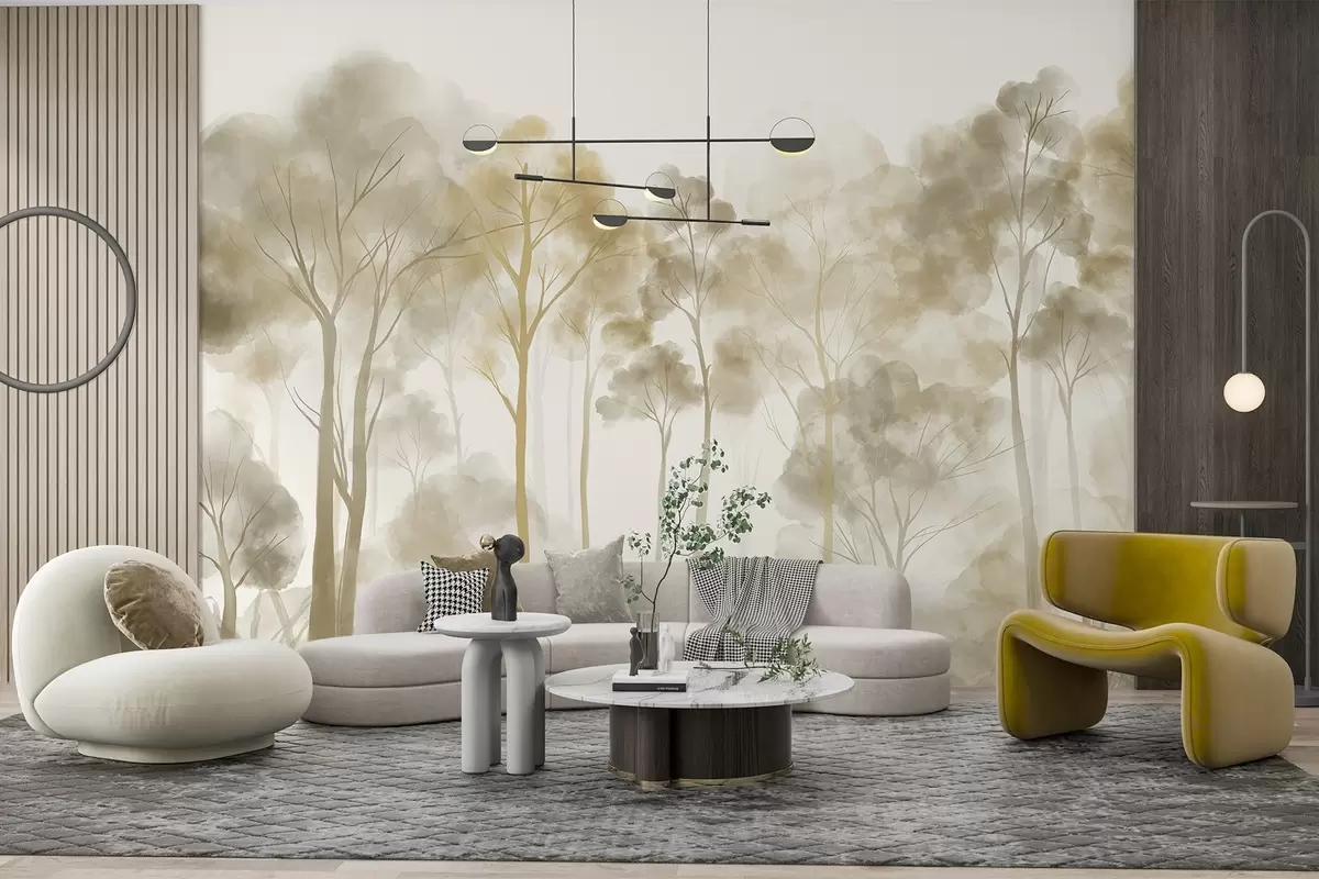 Fotomurales Bosque estilo acuarela con altos árboles claros en tonos beige y amarillo, con una atmósfera de niebla Nr. w08870