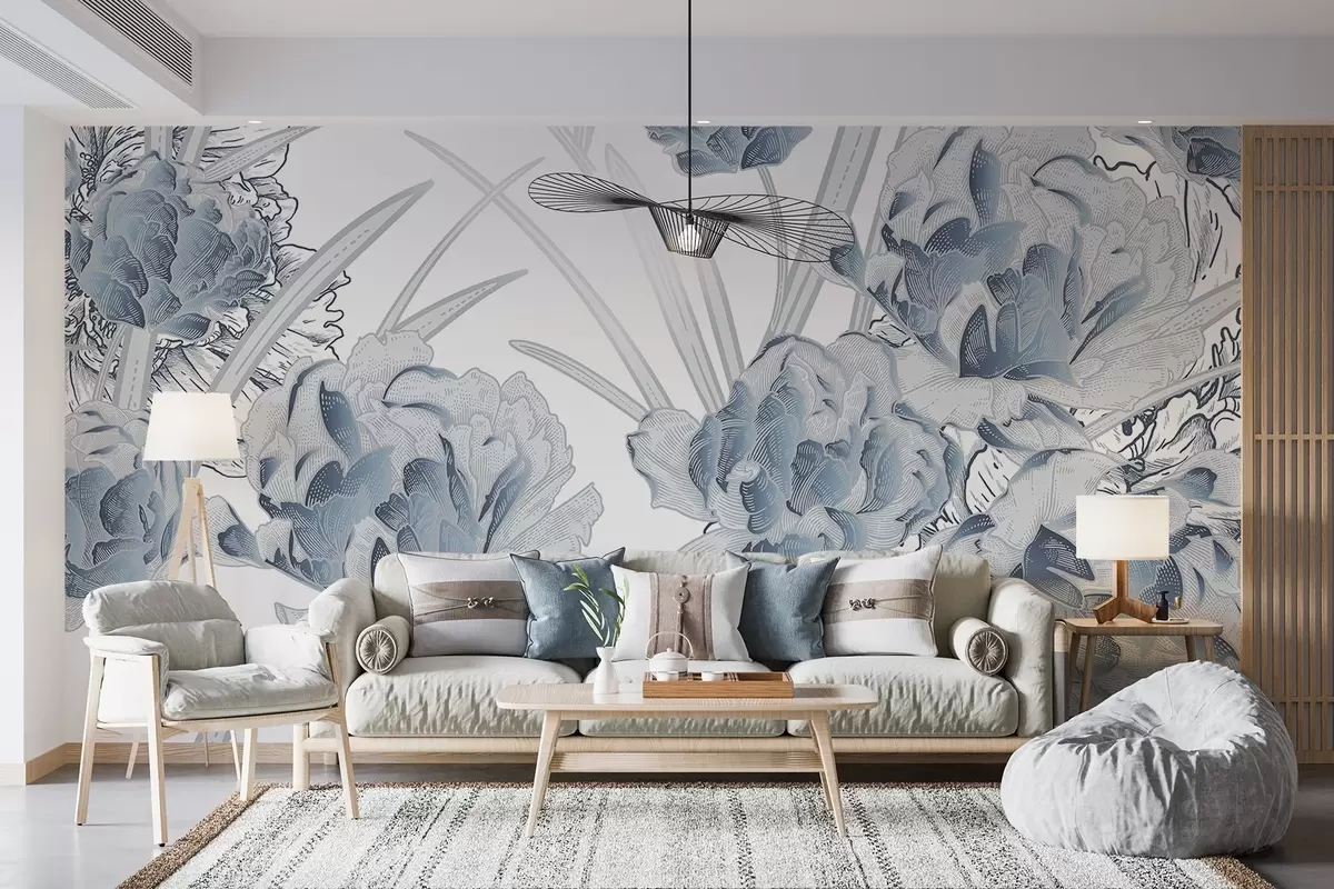 Fotomurales Peonías azules con hojas sobre fondo blanco, diseño floral, ilustración botánica Nr. w08896